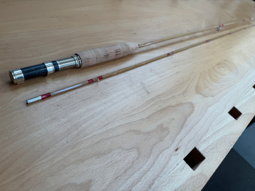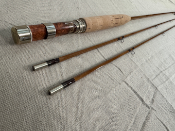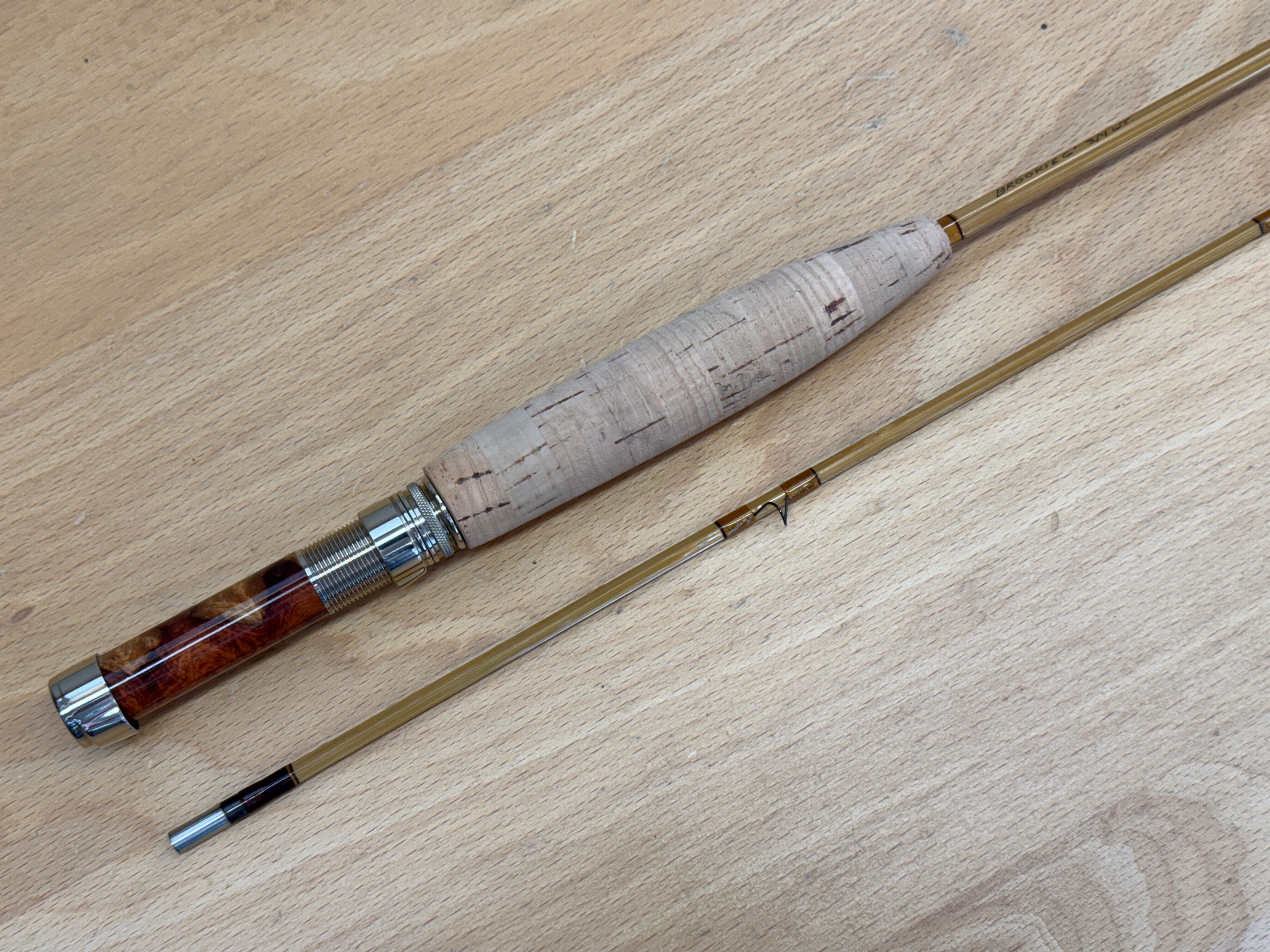 --SOLD -- We have one of our popular pentagonal Brookie Rods available. It is a model B6024, serial #2120, a 6' 2 piece fly rod for a 4 weight line. It is natural blond in color, with nickel silver ferrules, knurled, down-locking reel-seat hardware, and a beautiful Amboyna burl wood reel-seat insert, with brown silk wraps and a tapered 6" grip. It has a medium/fast action and is perfect for small streams and lakes, and is very portable and a lot of fun to cast. Click here to view the complete list of our Brookie models, and click on the image for a more detailed view. This rod is available now for $749.99! As all our rods, it comes in a high quality aluminum rod tube with our logo and a quality cloth bag.