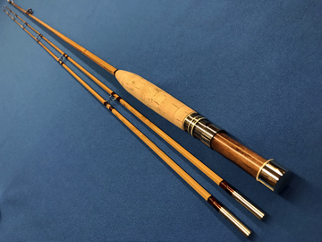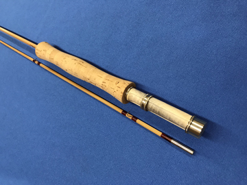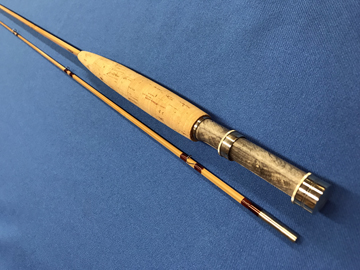 --SOLD -- This is one of our most popular rods. It's one of our pentagonal Signature Rods that is now available. It is a model S764, serial #2090, a hollowed, 7'6" 2 piece 2 tip fly rod for a 4 weight line. It is a natural blond color, with blued nickel silver ferrules with a knurled, down-locking reel-seat, with a beautiful varnished Amboyna burl wood reel-seat insert, with blue & yellow silk wraps and a 6" tapered grip. The butt cap has our logo engraved on it. It has a medium+/fast action with plenty of reserve power and is perfect for streams and lakes, a good all-round rod. Click here to view the complete list of our Signature models, and click on the image for a more detailed view. This rod is available now for $1399.99. As all our rods, it comes in a high quality aluminum rod tube with our logo and a quality cloth bag.