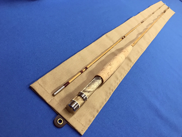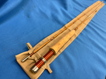 (Available at the Virginia Lakes Resort, Virginia Lakes, California or direct from us) This is one of our new Trout Scout model rods. It's a hollowed, pentagonal version of our discontinued Trout Scout hexaonal rods that is available. It is a model S7614-5, serial #2124, a 7'6" 2 piece fly rod for a 4/5 weight line. It is natural blond in color, with nickel silver ferrules and down-locking reel-seat hardware, and a beautiful Cocobolo wood reel-seat insert, with red silk wraps and a 6" tapered grip. The butt cap has our logo engraved on it. It has a semi-gloss finish and is very similar to our Signature models but more affordable. It has a medium/fast action and is perfect for streams and lakes, a good all-round rod, and is very popular with guides. Click on the image for a more detailed view. This rod is available now for $899.99. As all our rods, it comes in a high quality aluminum rod tube with our logo and a quality cloth bag.