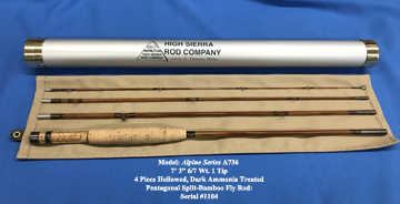 --SOLD -- Here we have one of our famous pack rods. It's one of our pentagonal Alpine Rods that is now available. It is a Custom model A736, serial #1104, a 7'3" 4 piece 1 tip hollowed fly rod for a 6/7 weight line. It has been ammonia treated to a beautiful uniform dark brown color, with blued nickel silver ferrules and down-locking reel-seat hardware, with an beautiful Maidow burl wood reel-seat insert, with brown & gold silk wraps and a 6" tapered grip, made out of 1/4" cork rings for a classic look. The butt cap has our logo engraved on it. It has a fast action and is great for larger streams and lakes, and perfect for back packing to remote streams and lakes and travels easily. Click here to view the complete list of our Alpine models, and click on the image for a more detailed view. This rod is available now for $1599.99. As all our rods, it comes in a high quality aluminum rod tube with our logo and a quality cloth bag.