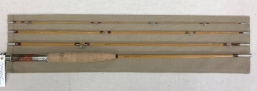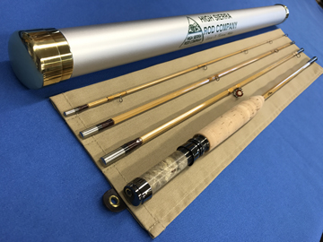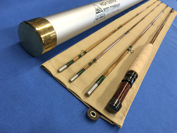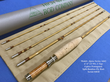 --SOLD-- Here we have one of our famous pack rods. It's one of our pentagonal Alpine Rods that is now available. It is a model A662, serial #4818, a 6'6" 4 piece. 2 tip fly rod for a 2/3 weight line. It is natural blond in color, with polished nickel silver ferrules with a knurled, down-locking reel-seat, with an beautiful light colored Madrone burl wood reel-seat insert, with brown & gold silk wraps and a 5" tapered grip, made out of 1/4" cork rings for a classic look. The butt cap has our logo engraved on it. (This rod comes with two NOS (new old stock) small loop tip tops) It has a medium action and is great for small streams and lakes, and perfect for back packing to remote streams and lakes and travels easily. Click here to view the complete list of our Alpine models, and click on the image for a more detailed view. This rod is available now for $1699.99. As all our rods, it comes in a high quality aluminum rod tube with our logo and a quality cloth bag. |