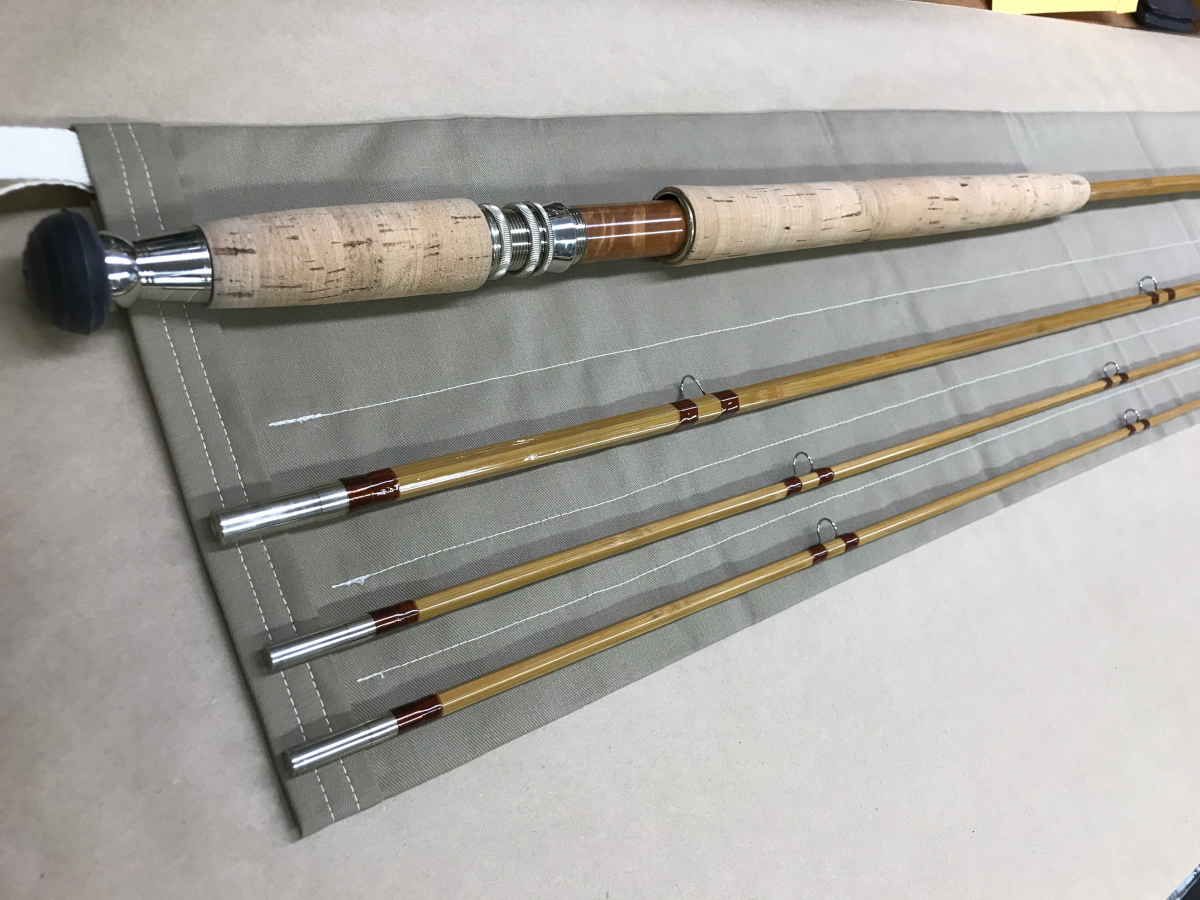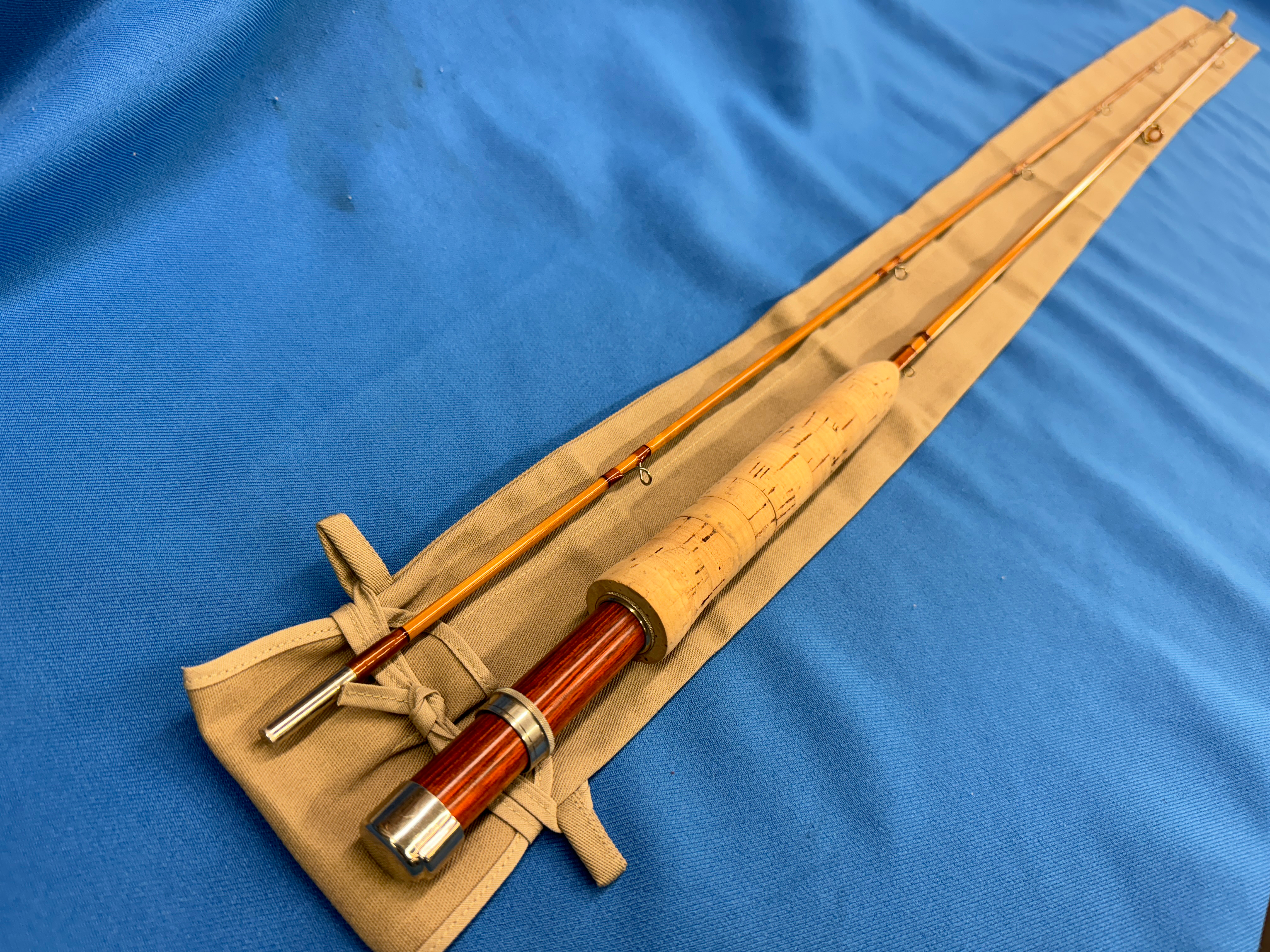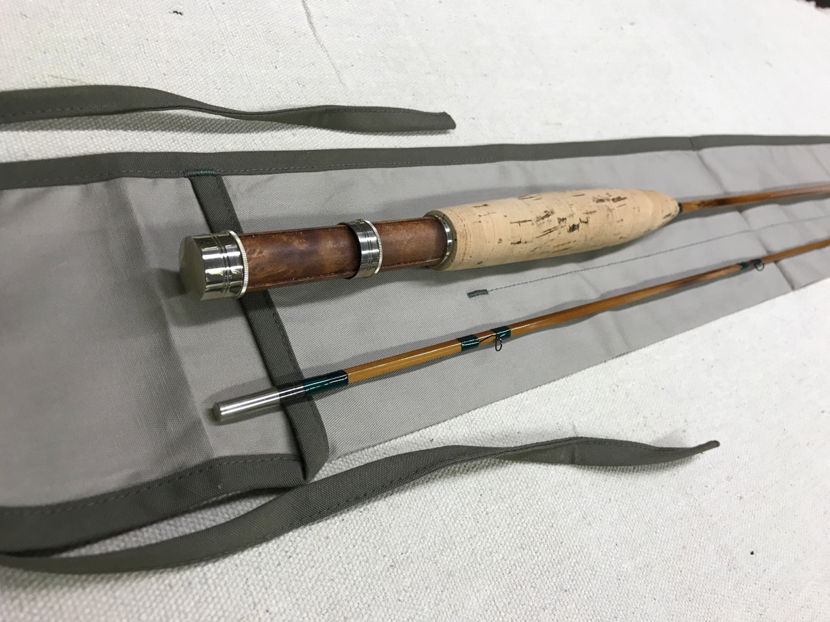 --SOLD-- This is one of our most popular rods. It's one of our pentagonal Signature Rods that is now available. It is a model S805, serial #1049, a hollowed, 8'0" 2 piece fly rod for a 5/6 weight line. It is flamed brown color, with blued nickel silver ferrules with a knurled, down-locking reel-seat, with a beautiful varnished English Walnut wood reel-seat insert, with green & black silk wraps and a 6" tapered grip, made out of 1/2" cork rings. The butt cap has our logo engraved on it. It has a medium+/fast action with plenty of reserve power and is perfect for streams and lakes, a good all-round rod. Click here to view the complete list of our Signature models, and click on the image for a more detailed view. This rod is available now for $1199.99. As all our rods, it comes in a high quality aluminum rod tube with our logo and a quality cloth bag.