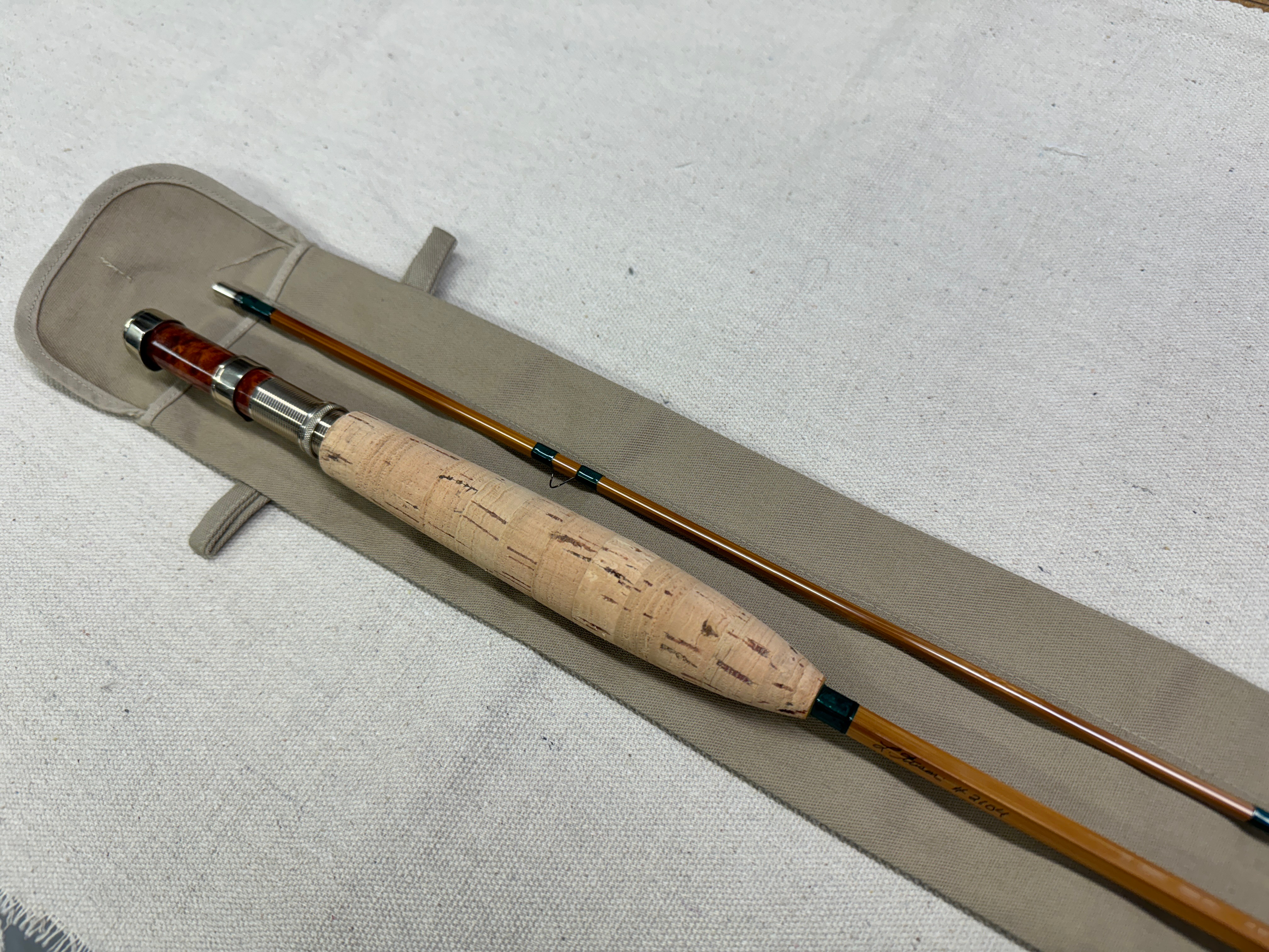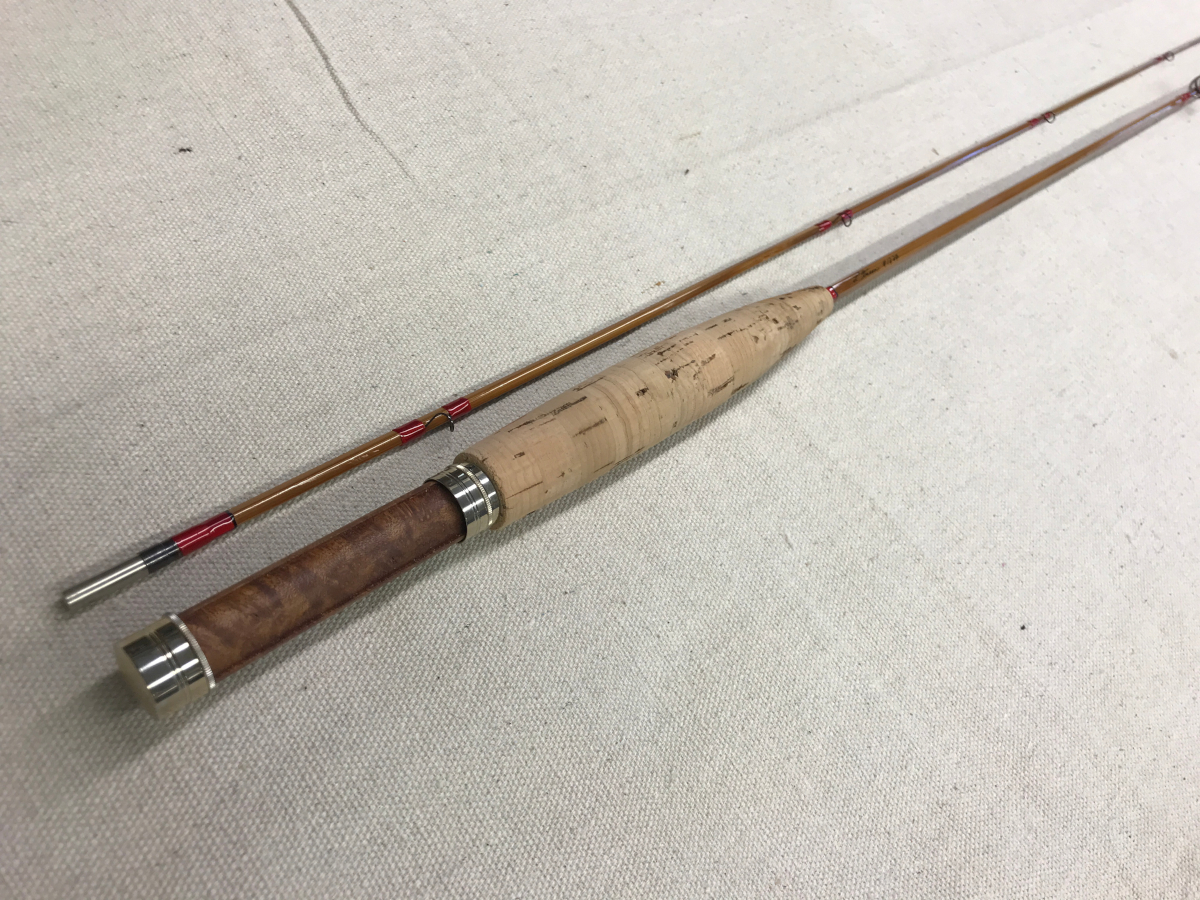 --SOLD -- This is one of our most popular rods. It's one of our pentagonal Signature Rods that is now available. It is a model S764, serial #2091, a hollowed, 7'6" 2 piece 2 tip fly rod for a 4 weight line. It is a natural blond color, with blued nickel silver ferrules with a knurled, down-locking reel-seat, with a beautiful varnished Amboyna burl wood reel-seat insert, with red & black silk wraps and a 6" tapered grip. The butt cap has our logo engraved on it. It has a medium+/fast action with plenty of reserve power and is perfect for streams and lakes, a good all-round rod. Click here to view the complete list of our Signature models, and click on the image for a more detailed view. This rod is available now for $1399.99. As all our rods, it comes in a high quality aluminum rod tube with our logo and a quality cloth bag.