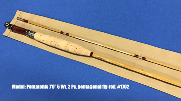 --SOLD-- (Available at the Virginia Lakes Resort, Virginia Lakes, California or direct from us) This is one of our popular pentagonal Pentatonic Rods that is available. It is a model P7025, serial #1702, a 7' 2 piece fly rod for a 5 weight line. It is natural blond in color, with nickel silver ferrules and knurled, down-locking reel-seat hardware, and a beautiful Rosewood wood reel-seat insert, with rose silk wraps and a 6" tapered grip. The butt cap has our logo engraved on it. It has a medium/fast action and is perfect for streams and lakes, a good all-round rod, and is very popular with guides. Click here to view more information on our 4/5 weight model, and click on the image for a more detailed view. This rod is available now for $899.99. As all our rods, it comes in a high quality aluminum rod tube with our logo and a quality cloth bag.