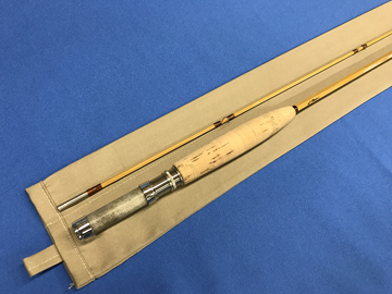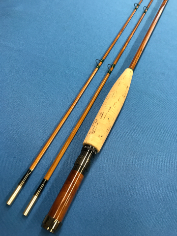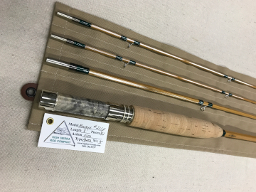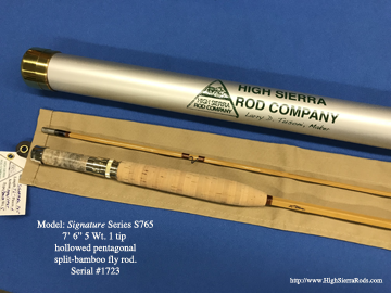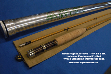 --SOLD -- This is one of our most popular rods. Its one of our pentagonal Signature Rods that is now available. It is a model S765, serial #1707, a hollowed, 7'6" 2 piece fly rod for a 5 weight line. It is natural blond in color, with blued nickel silver ferrules with a slide-band, down-locking reel-seat, and a beautiful Circassian Walnut wood reel-seat insert, with brown & gold silk wraps and a 6" tapered grip, made out of 1/4" cork rings for a classic look. The butt cap has our logo engraved on it. It has a medium/fast action and is perfect for streams and lakes, a good all-round rod. Click here to view the complete list of our Signature models, and click on the image for a more detailed view. This rod is available now for $1199.99. As all our rods, it comes in a high quality aluminum rod tube with our logo and a quality cloth bag.