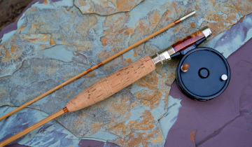 --SOLD -- We have one of our popular pentagonal Brookie Rods available. It is a model B60245, serial #2210, a 6' 2 piece fly rod for a 4/5 weight line. It is natural blond in color, with nickel silver ferrules, down-locking, slide-band reel-seat hardware, and a beautiful Walnut wood reel-seat insert, with red silk wraps and a reverse half-wells grip. It has a medium/fast action and is perfect for small streams and lakes, and is very portable and a lot of fun to cast. Click here to view the complete list of our Brookie models, and click on the image for a more detailed view. This rod is available now for $649.99 (Normally $749.99!). As all our rods, it comes in a high quality aluminum rod tube with our logo and a quality cloth bag.